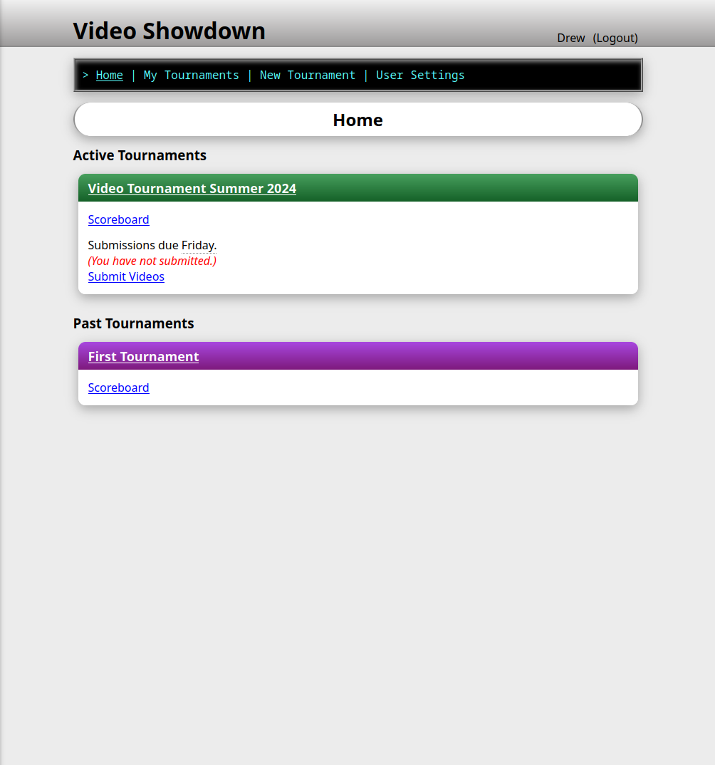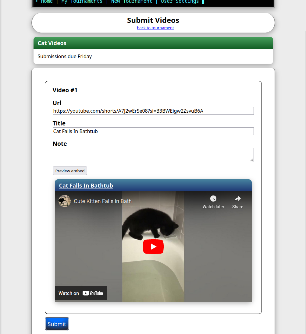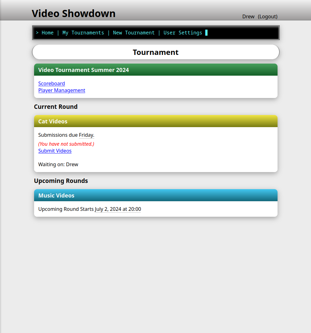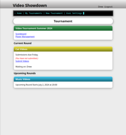 The Tournament owner creates rounds with themes, for example "Cat Videos". Players submit videos that match the theme, and then vote and comment on other submissions.